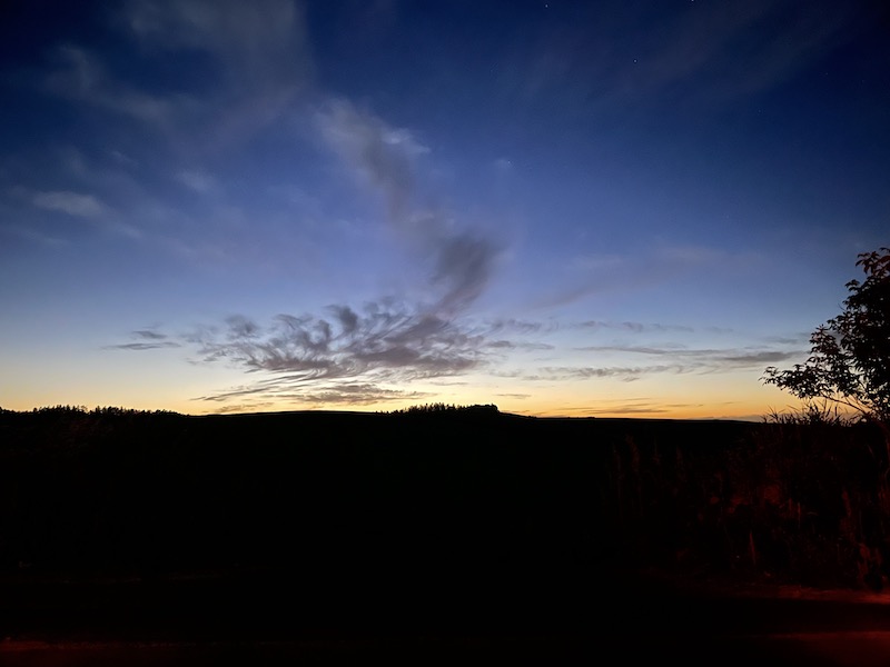滞在先の近くの畑から目を見張るような夕暮れをパチリ。↓