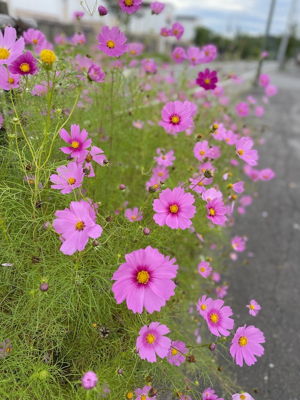 街路樹にもうコスモスが綺麗に咲いていました。もう秋です。