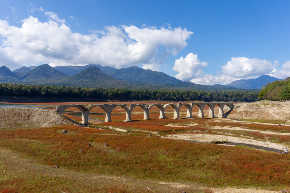 このタウシュベツ橋梁は糠平湖(ぬかびらこ)という人口湖に沈む橋で