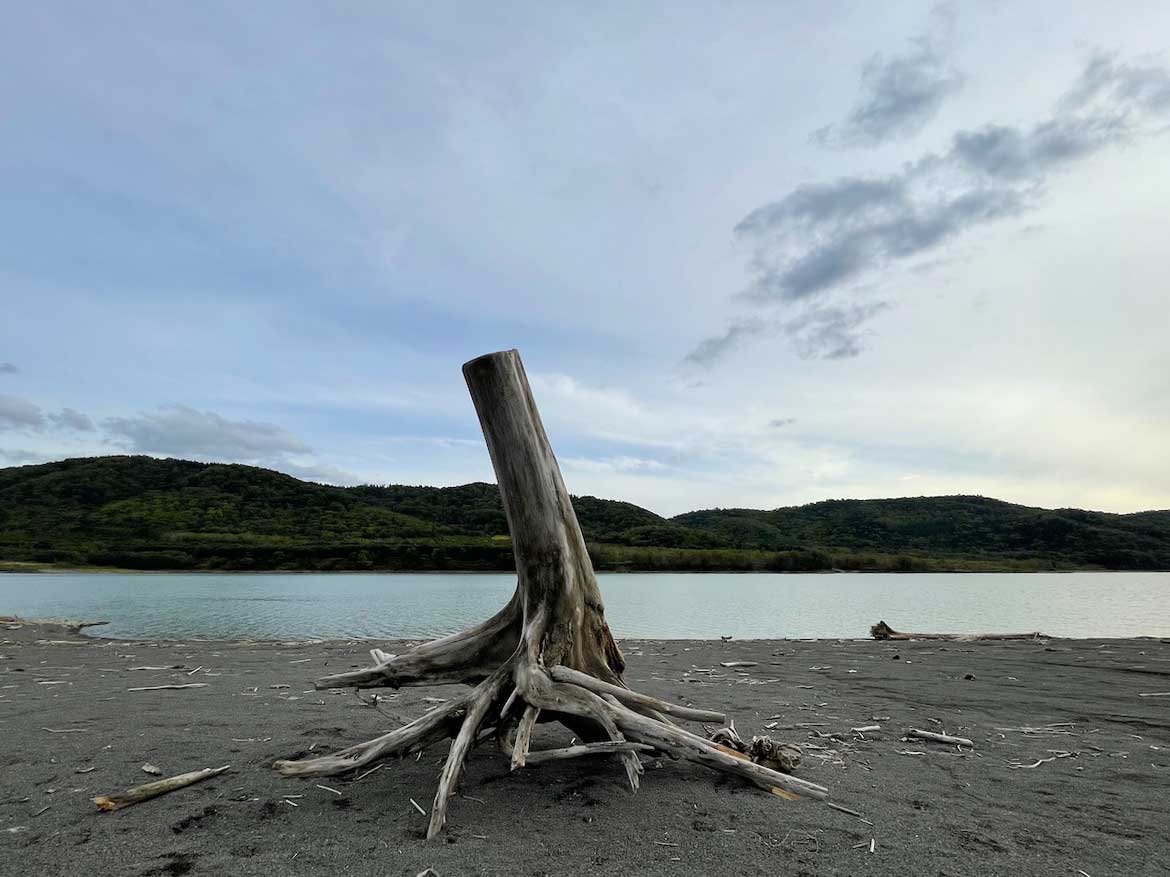 写真は釣りに行った忠別湖の湖岸にあった流木です。