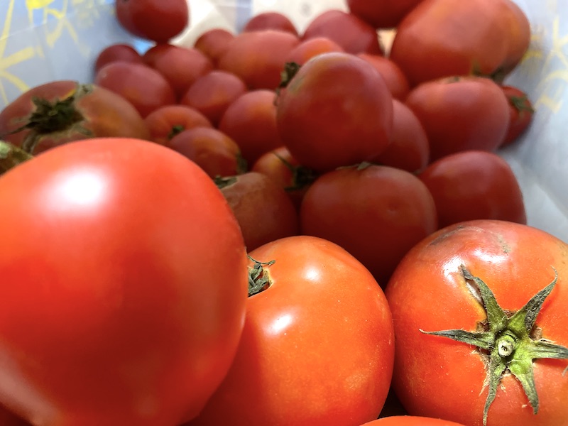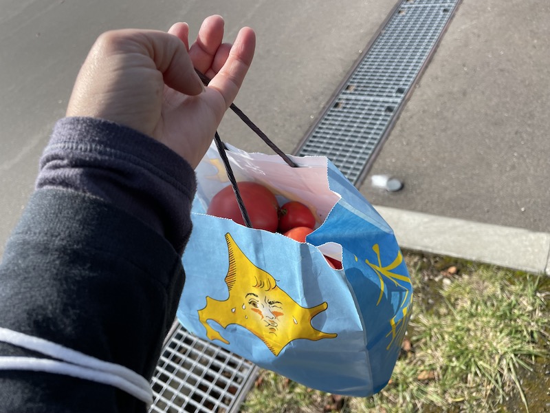 差し出された紙袋を見るとたくさんのトマトが入っています。